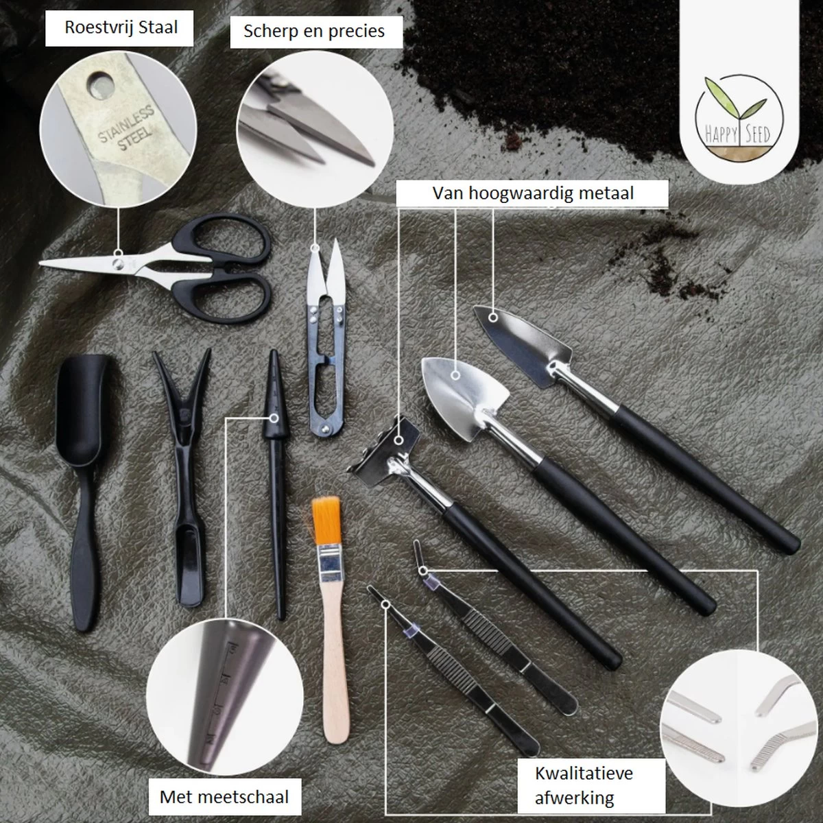 DOOS INHOUD – De set bestaat uit 1 zaailing lifter, 1 prikstok, 3 scheppen (een rondeschep, een spitse schep en een lepel schep), 3 scharen, 2 pincetten, 1 hark, 1 borstel en een handige opbergzak om je starter set in te bewaren.