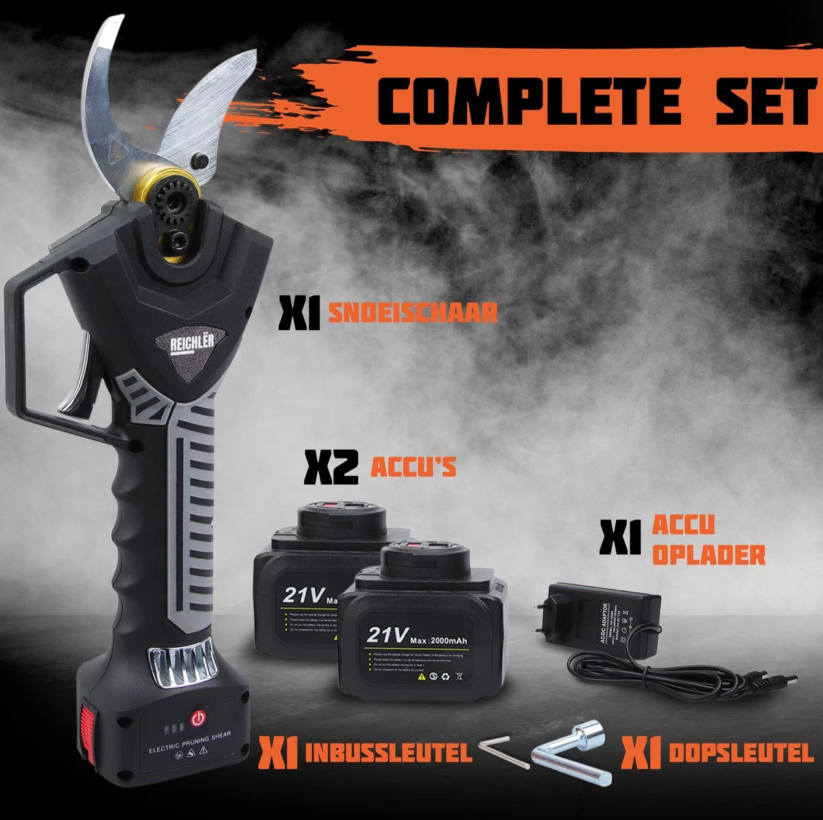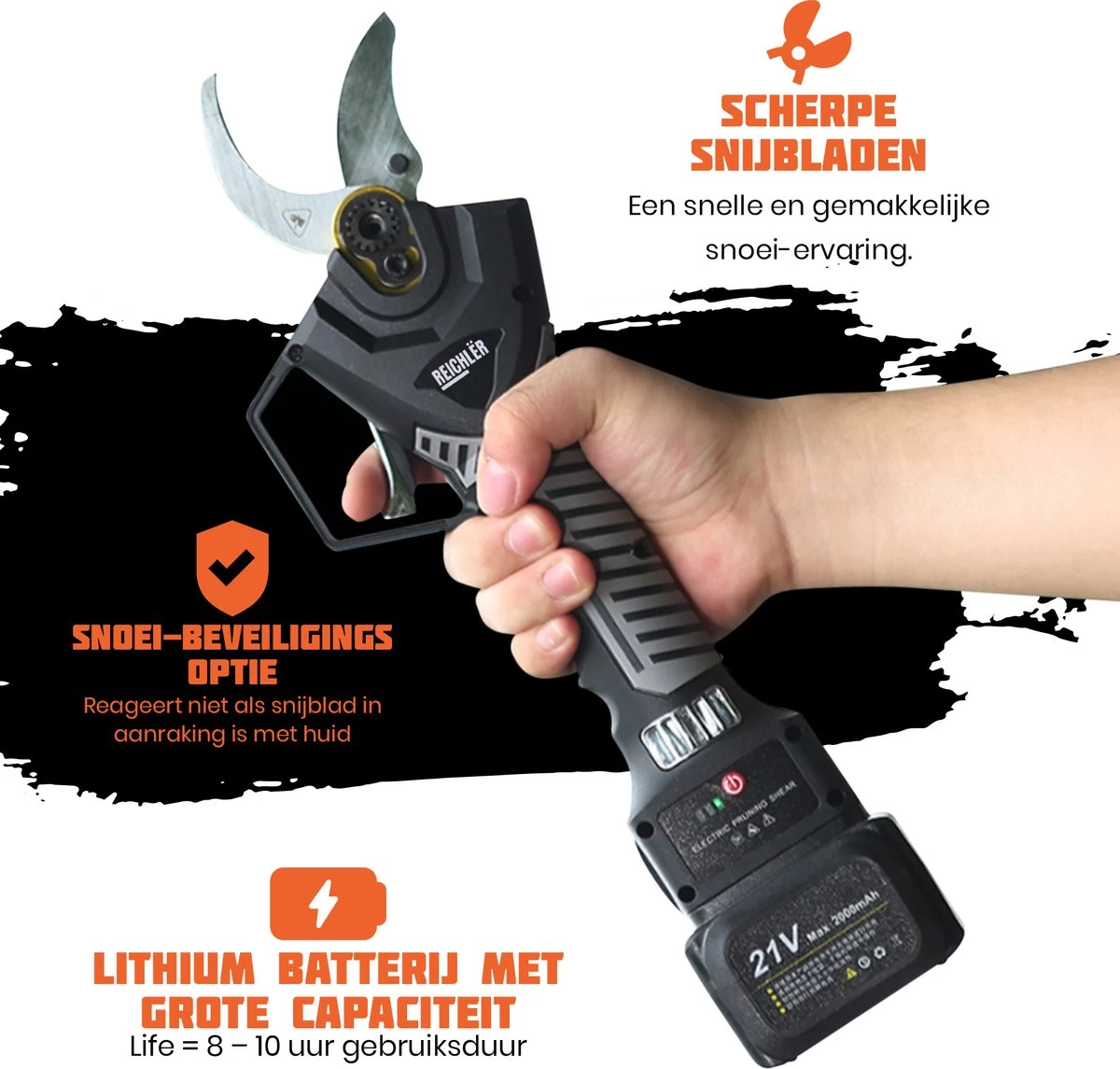 Reichlër® Elektrische Snoeischaar – 40 Mm Snijdiameter – 2x Accu – Anti-cut Functie – Heggenschaar – Takkenschaar – Zwart